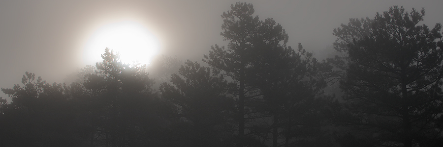 Surreal shot of the sun just breaking thru the trees and fog