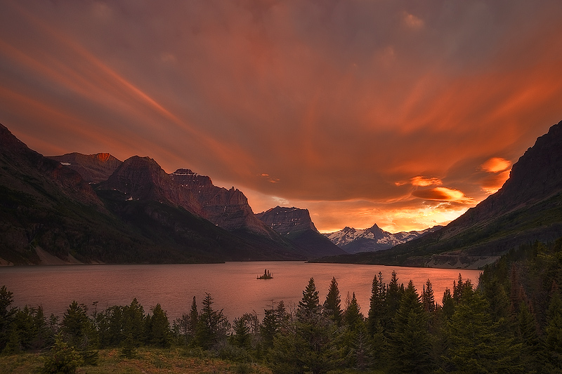 A stunning sunset at Saint Mary lake in Glacier National Park. Everything just fell into place as far as the weather was concerned. The streaks of orange only lasted for a few moments, very lucky to have been there.
