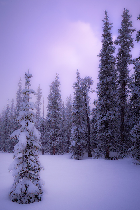 New snowfall covers the trees as the morning sun lights the sky for just a moment creating beautiful light