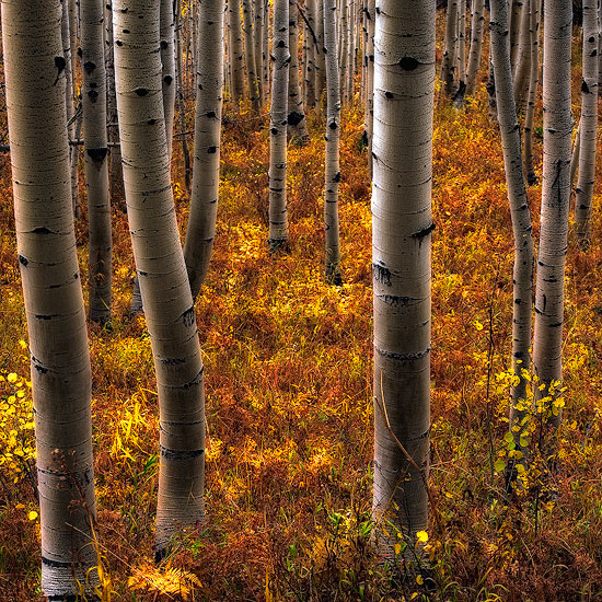 A beautiful aspen grove rising above colorful grasses and flowers.